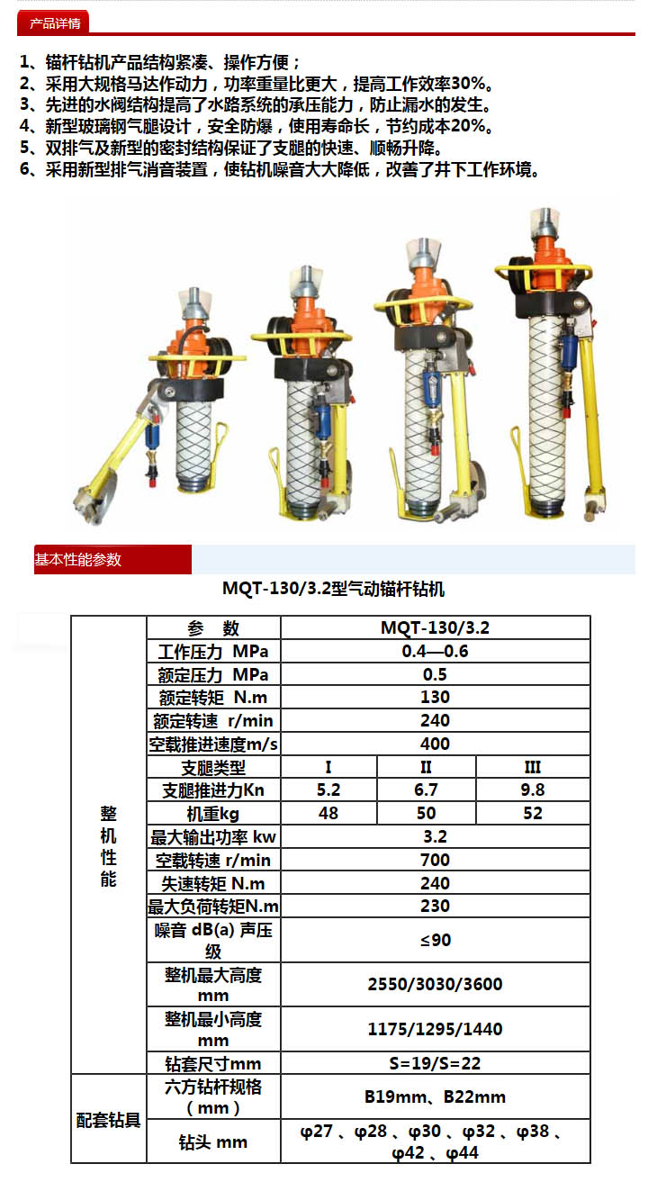 適用范圍:MQT-130/3.2型氣動錨桿鉆機適用于頂板硬度f≤10的煤、半煤巷巖及巖巷的錨護作業,集鉆孔、攪拌、安裝錨桿于一身。用于煤礦井下支擴作業,也適用于鐵礦、隧道的施工和護坡工。